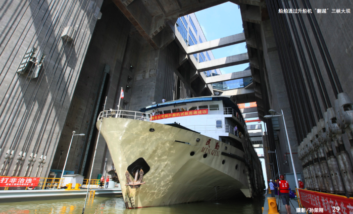 驅(qū)動(dòng)機(jī)構(gòu)啟動(dòng),齒輪沿齒條爬行,船廂以每秒0.2米的速度勻速上升,與此同時(shí),驅(qū)動(dòng)機(jī)構(gòu)驅(qū)動(dòng)安全機(jī)構(gòu)、對(duì)接鎖定機(jī)構(gòu)的螺桿沿螺母柱空轉(zhuǎn),同步運(yùn)行;當(dāng)船廂運(yùn)行至上游航道水位時(shí),船廂停車,船廂對(duì)接鎖定機(jī)構(gòu)動(dòng)作,上、下鎖定螺桿與螺母柱接觸,上游間隙密封機(jī)構(gòu)伸出與上閘首工作門對(duì)接,間隙充水至與上游水位齊平,閘門開啟,船廂水域與上游引航道水域連通,船只駛離船廂。單程通過時(shí)間約為37分鐘。