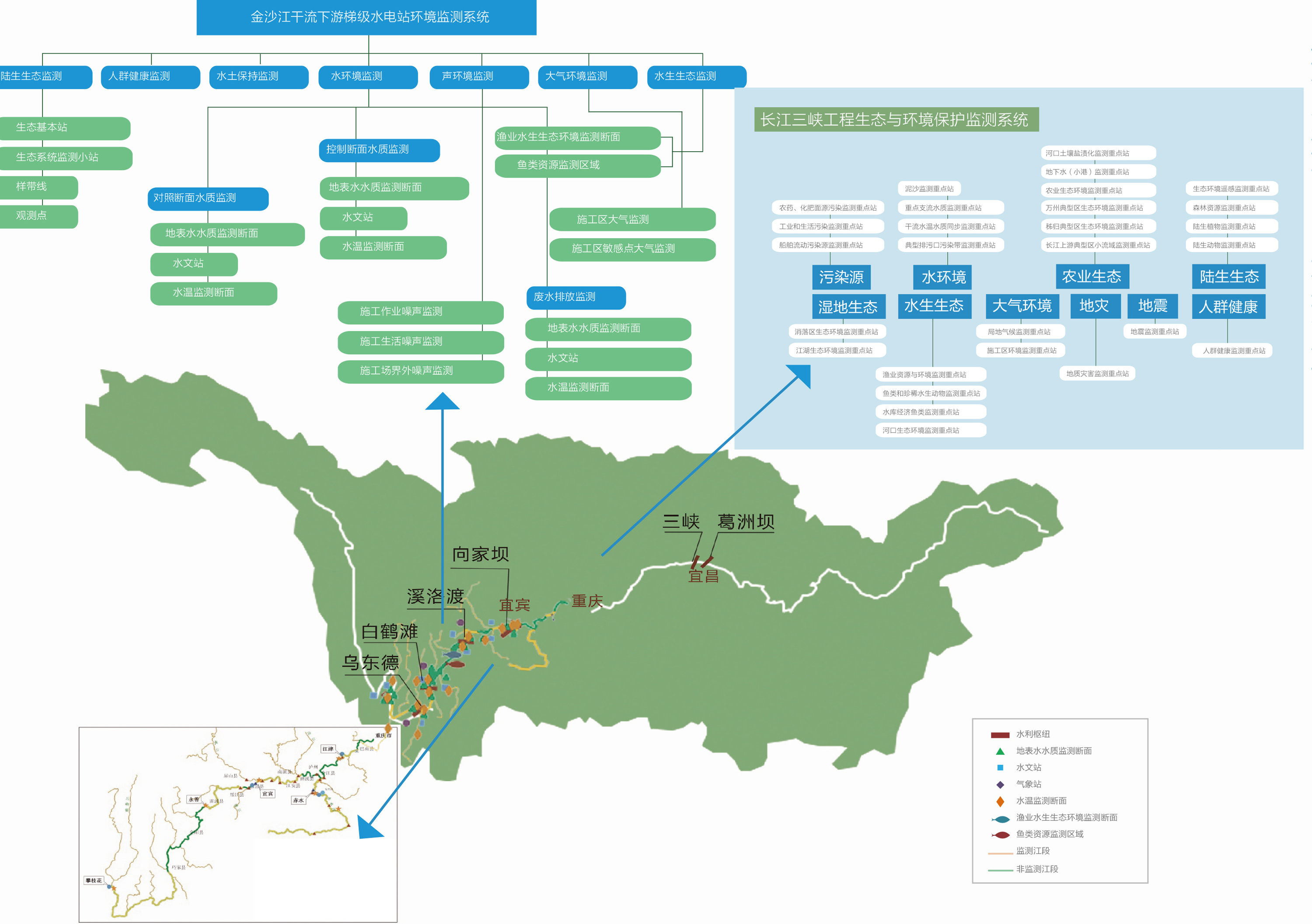 金沙江干流下游流域生態(tài)環(huán)境監(jiān)測(cè)系統(tǒng)。結(jié)合流域生態(tài)環(huán)境變化和開(kāi)發(fā)建設(shè)實(shí)際情況,有序?qū)嵤┙鹕辰掠瘟饔蛏鷳B(tài)環(huán)境監(jiān)測(cè),包含流域水質(zhì)監(jiān)測(cè)、水生生態(tài)監(jiān)測(cè)、陸生生態(tài)監(jiān)測(cè)、長(zhǎng)江攀枝花-宜昌江段水溫監(jiān)測(cè)、流域過(guò)飽和氣體監(jiān)測(cè)等。